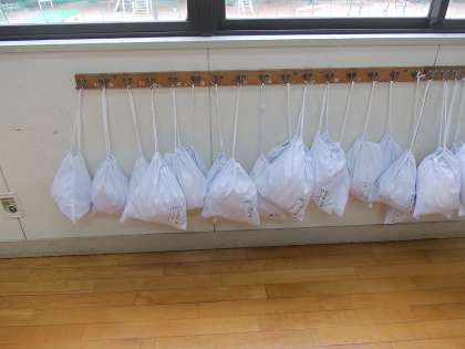 給食エプロンも、きちんとぶら下げています。6年間のお約束です。