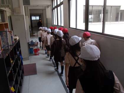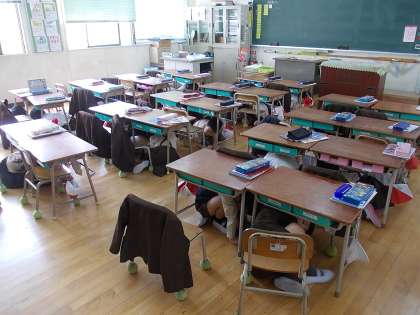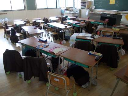 地震が発生したら机の下にもぐります。特に頭を守ります。