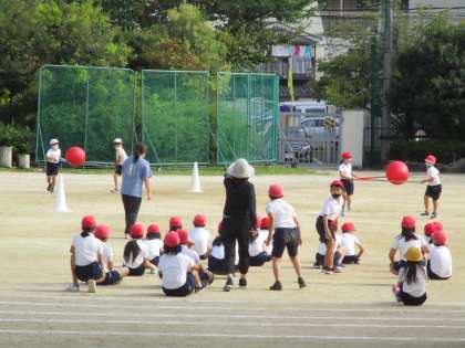 写真はそれぞれ6年生団体演技、5年生団体演技、4年生団体競技の練習の様子です。