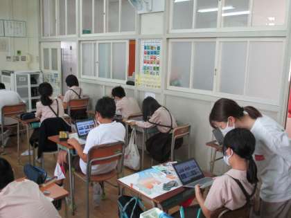 自分の描きたい世界遺産をタブレット端末で調べながら、その特徴や形を絵に表しています。色ぬりも始まり、だんだん仕上がってきました。