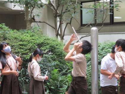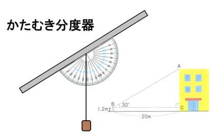 今日は、かたむき分度器を使って、実際の校舎の長さを計算で求めました。