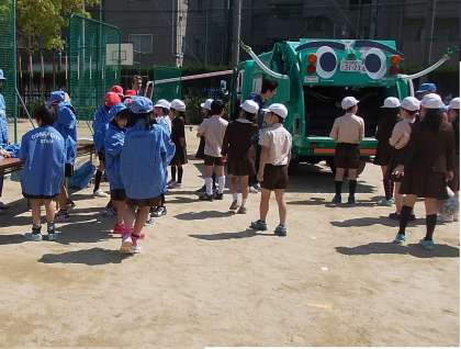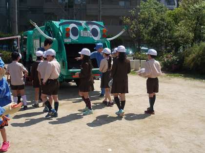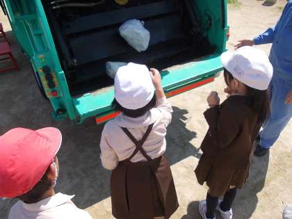 各自で持参したごみ袋を、パッカー車に入れる体験をしました。2人組でスイッチを入れる人と切る人の担当を決めました。ちょっとびっくりしました。