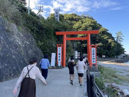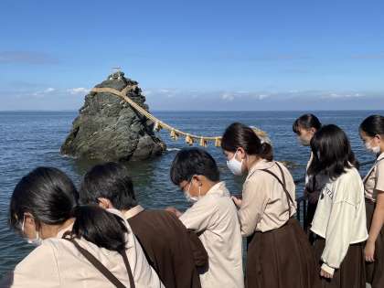 二見浦に到着し、夫婦岩の前で記念写真を撮りました。これで、予定されていたすべての行程はおしまいです。今からバスに乗って、学校に帰ります。