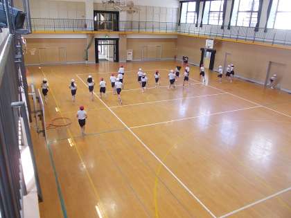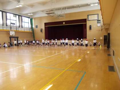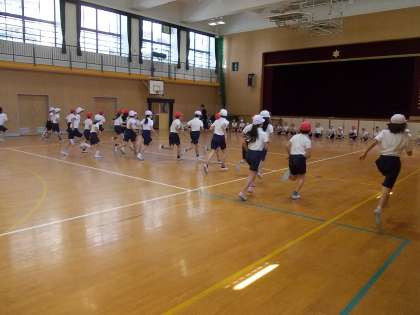 今週は、スポーツテスト週間です。5年生が、シャトルラン(往復持久走)に取り組んでいました。テスト用CDに合わせて、20m走を何回できるか持久力を測ります。