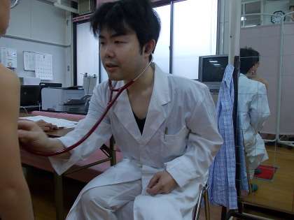 今年度から内科の学校医先生が新しく就任されました。校区内で開業されている岡本昌邦先生です。心臓の音や呼吸の様子、皮膚の状態、姿勢などを診ていただきます。