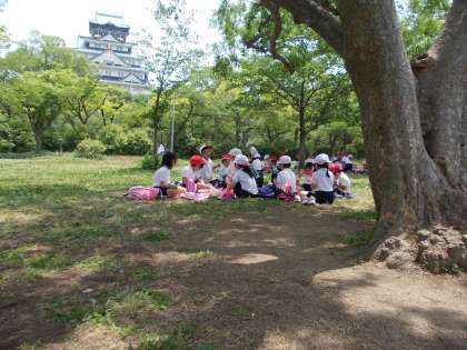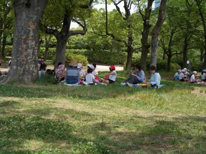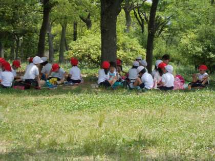 木陰で、1年生2年生が一緒に仲良くお弁当を食べました。