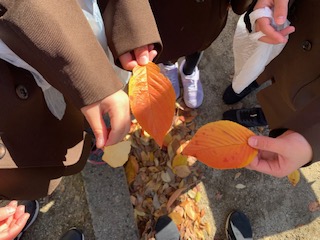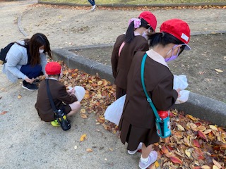 公園内で、様々な落ち葉やドングリを見つけ、実際に触って感触を楽しんだり、香りを感じたりしました。お気に入りの落ち葉やドングリは、、次の学習に使用するため、学校に持ち帰りました。