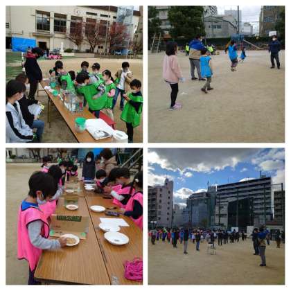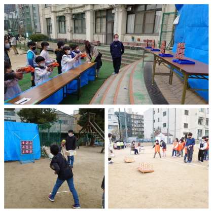 本日、本校運動場で中津地域青少年指導委員会主催の「ビックゲーム」が開催されました。本校の児童100名以上が参加し、たてわりの10グループに分かれ、10種類の遊びのコーナーを回り、点数を競いました。