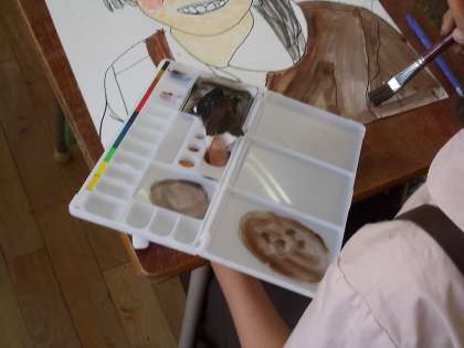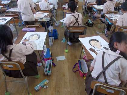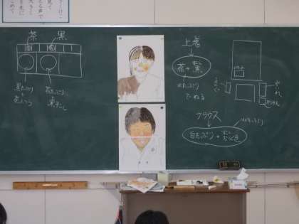 自画像を描きながら、色づくり(混色)の学習をしています。みんな個性的で、自分の特徴をよくとらえていました。