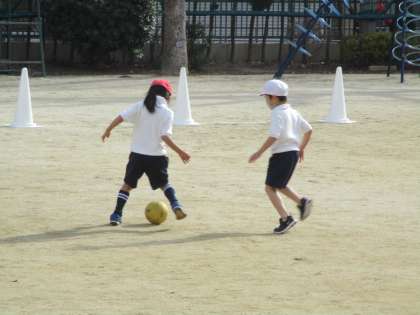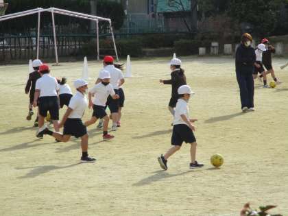 手を使わずに、足だけでボールを操作し、ドリブルしたり、友達のボールを取りに行ったりしました。寒い中でしたが、子どもたちは夢中になって活動していました。