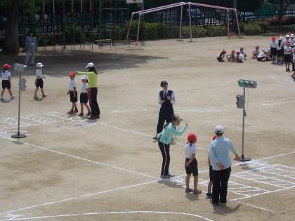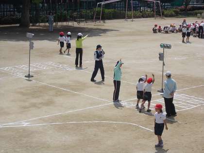 横断歩道は手をあげてわたります。信号が青の時も、右左右の確認、そして、最後にもう一度信号を確認してから横断します。