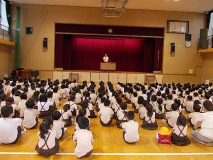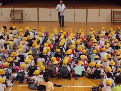 2学期がスタートしました。子どもたちの元気な声に、教職員一同、ほっと一安心です。始業式のあと、11時30分から「暴風警報が発令された」の想定で避難訓練を実施しました。子どもたちは帰る用意をして講堂に集合し、集団下校をしました。