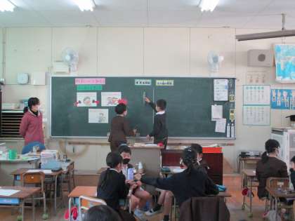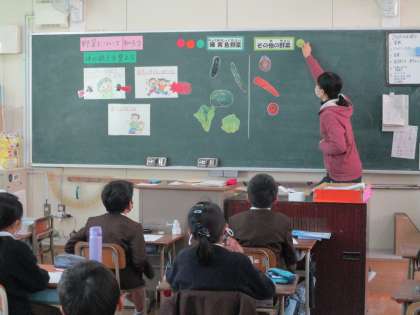 今日は4年生で、「野菜について知ろう」という食育の授業がありました。野菜のはたらきを学習したあと、8種類の野菜の写真を見て、緑黄色野菜なのかどうか、話し合って考えました。さらに、野菜をたくさん食べるための工夫を出し合うと、「鍋!」。そう、どっさりの野菜もみるみるかさが減りますね。野菜をしっかり食べてあと少しの寒さを乗り切りたいですね。