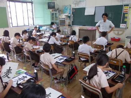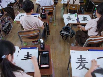 そして、練習プリントを2枚書いた(なぞった)あと、今日の清書を1枚先生に提出します。それを、先生が朱液書きします。