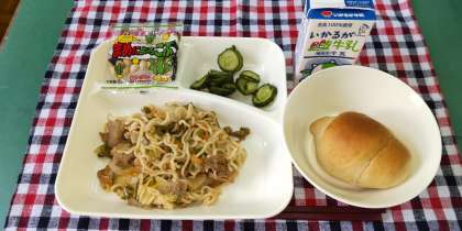 <やきそば きゅうりのしょうがづけ 豆こんぶ 1/2パン 牛乳>