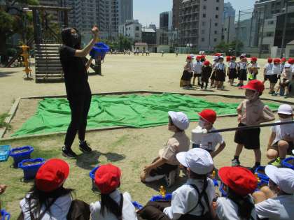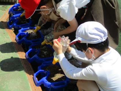 植木鉢に土を入れ、指を使って穴を作り、一粒ずつ丁寧に植えました。