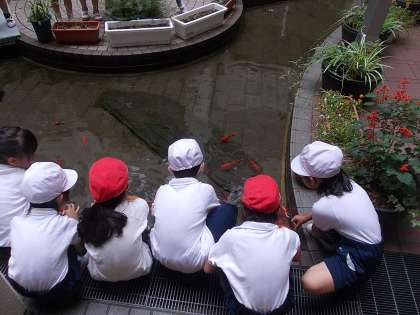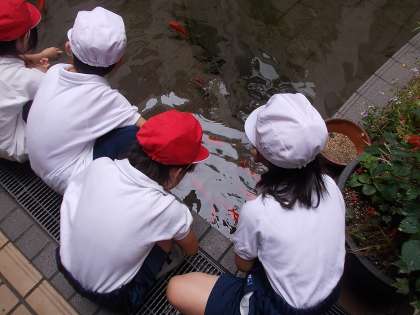 1年生が金魚にエサをやってくれています。ひとつぶひとつぶ大事にあげています。