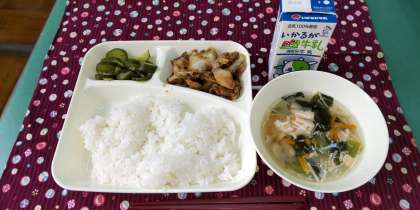 <ホウイコウロー 鶏肉と野菜の中華スープ きゅうりのピリ辛あえ ごはん 牛乳>