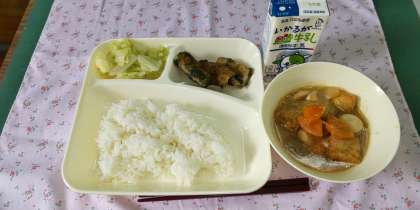 「大きいおかずのさといもがおいしかった。みそのお汁がたくさんでおいしかった。」