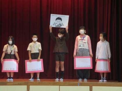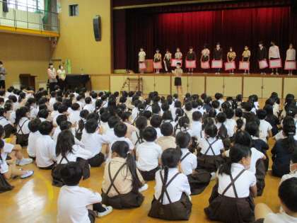 全校朝会で、健康委員会が「中津小目のたいそう」を全校児童に紹介しました。