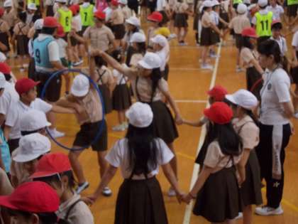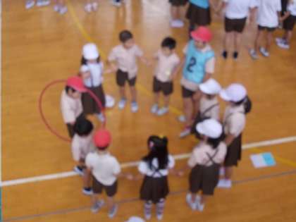 手を離さないようにフラフープを一周させ、そのあと、逆回りでもう一周させます。