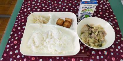 <中華煮 あつあげのピリ辛じょうゆかけ もやしの中華あえ ごはん 牛乳>