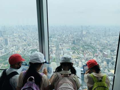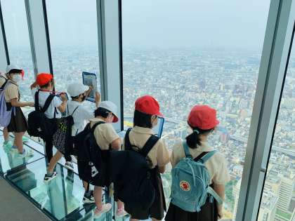 3年生が「あべのハルカス」へ社会見学に行きました。今年から社会科の学習が始まり、これまで自分たちが住んでいる大阪市について学習をしてきました。ハルカスでは、高さ300mのてんぼう台から大阪市全体を見渡し、東西南北それぞれの様子について学習しました。ビルが多いところや工場があるところ、鉄道がたくさん通っているところなどを実際に見て、新しい発見や疑問など、それぞれに学びがあったようです。