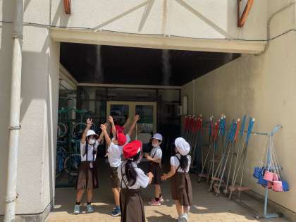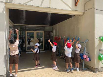 学校では、運動場のミストシャワーを稼働させています。子ども達は「涼しい〜!」と大喜びです。これからも体調に気をつけながら楽しく活動したいですね!