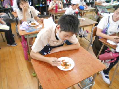 6年生の調理実習です。彩り野菜炒めを作りました。「朝食から栄養バランスのよい食事をしよう」をテーマに取り組みました。野菜の切り方や野菜を炒める順番など、班で話し合いながら、協力して取り組んでいました。