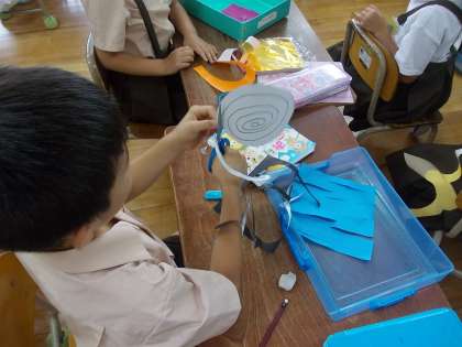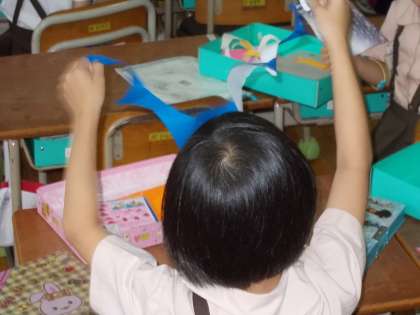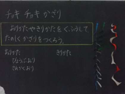 ハサミをちょきちょきとつかって、色紙を切ります。色々な飾りを作りました。