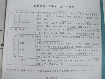 5年生の自然学習説明会のときにお配りした「食事メニュー予定表」についてです。