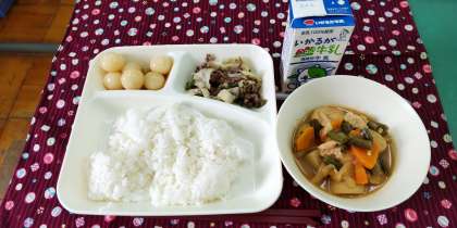 <一口がんもとさといものみそ煮 牛肉と野菜のいためもの みたらしだんご ごはん 牛乳>