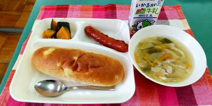 <ウインナーソーセージのケチャップソース スープ 焼きかぼちゃ おさつパン 牛乳>