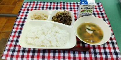 <プルコギ トック もやしの甘酢あえ ごはん 牛乳>