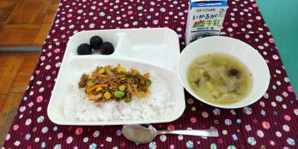 <野菜たっぷりカラフルライス キャベツときのこのスープ ぶどう(巨峰) 牛乳>