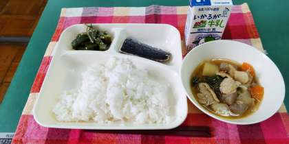 <さごしの塩焼き 豚肉とじゃがいもの煮もの オクラのいためもの ごはん 牛乳>
