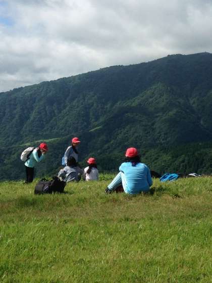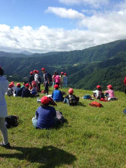 途中高丸山との分岐点でお茶、飴休憩です。少し遅れがちの子もいますが、59人全員順調です。