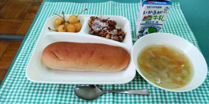 <なすのミートグラタン 鶏肉と野菜のスープ さくらんぼ(缶) 黒糖パン 牛乳>