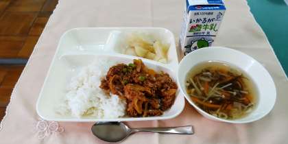 <タコライス もずくのスープ 焼きじゃが 牛乳>