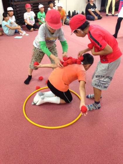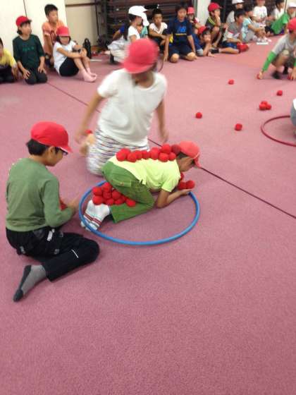 「おじぞうさま」これは1人がお地蔵様になって、お地蔵様にいくつ赤玉をのせられるかを競います。