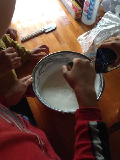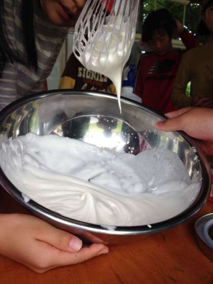 生クリームが立ってきたら、牛乳を入れて軽くかき混ぜます。