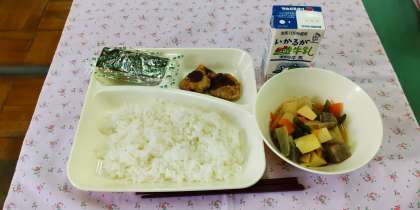 <みそカツ じゃがいもと野菜の煮もの 焼きのり ごはん 牛乳>
