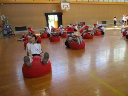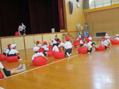 バランスボールをつかって、よい姿勢を保つための体幹を鍛える運動をしてみました。