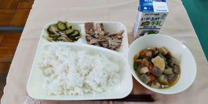 <豚肉のねぎじょうゆ焼き ふきよせ煮 きゅうりともやしの甘酢あえ ごはん 牛乳>