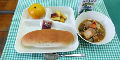 <豚肉といかの中華煮 大学いも みかん いちごジャム コッペパン 牛乳>
