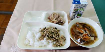 <鶏肉のゆず塩焼き ソーキ汁 ツナ大豆そぼろ ごはん 牛乳>