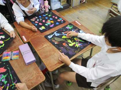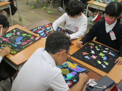 この時間は、黒い画面にスクラッチの技法で、パーティーの様子を描いていきました。