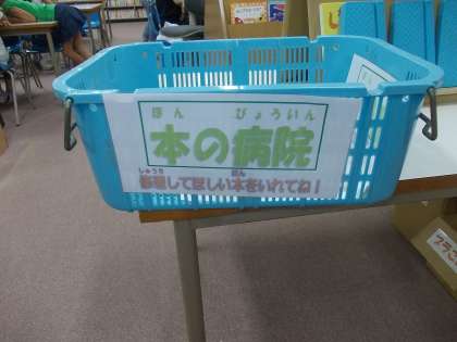 破けている本等は、「本の病院」ボックスに入れます。すると図書館ボランティアのみなさんが、修理してくださいます。