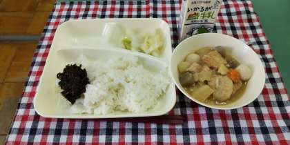 <関東煮 白菜の甘酢あえ のりのつくだ煮 ごはん 牛乳>