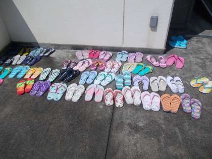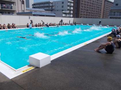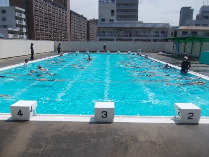 久しぶりの晴天で、たくさんの子どもたちが参加しています。さすが高学年、サンダルもきちんと並べられています。ふし浮きや蹴伸びもバッチリです。